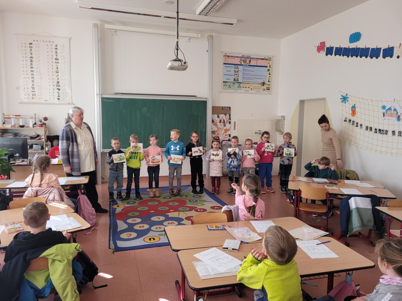 Děti si zazpívaly a zahrály na Orffovy hudební nástroje, s pomocí obrazového materiálu vymyslely krátký příběh, vytrhávaly horkovzdušný balón z papíru a pojmenovaly a roztřídily zvířátka - savci a ptáci.