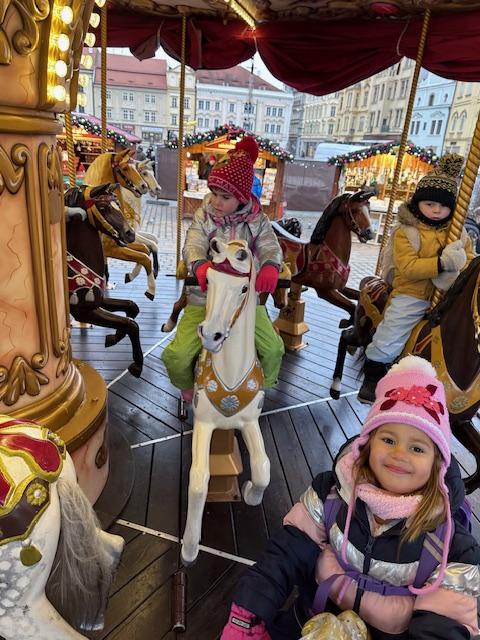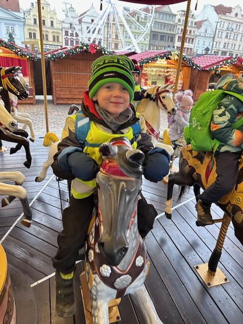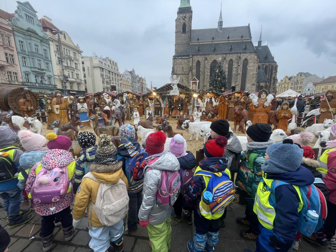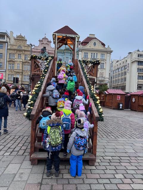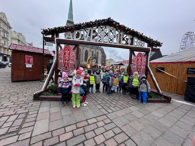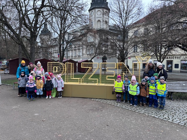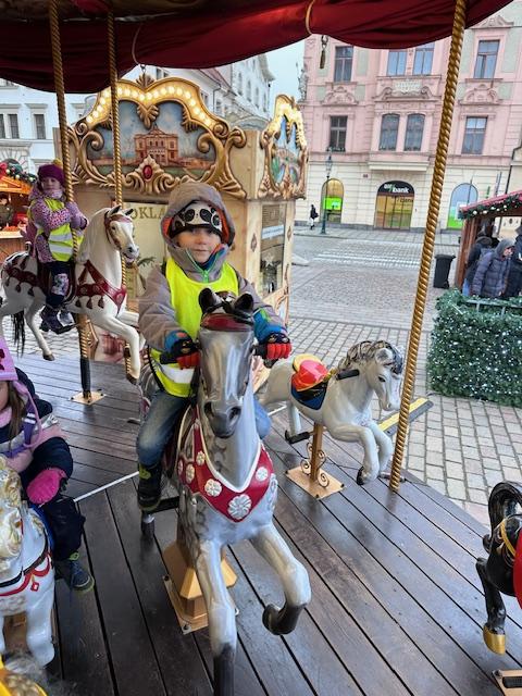 V pátek 13. 12. se společně třídy Myšek a Berušek vydaly na adventní trhy na plzeňské náměstí. Hned ráno pro nás měly paní kuchařky připravenou svačinku na cestu a mohli jsme se vydat za předvánočním dobrodružstvím. Pořádně jsme se oblékli a vyrazili na autobusovou zastávku, kde jsme nasedli na autobus směr Plzeň – cesta rychle utekla a nás čekala cesta pěšky na náměstí, po cestě jsme si dali svačinku a hurá na trhy. Na trzích jsme viděli spoustu krásných stánků, vánoční stromeček, živého oslíka a kozu, krásný velký betlém a nakonec jsme se svezli na kolotoči s koníky. Po jízdě jsme si každý zazvonili na zvonec a honem zpátky na autobus, abychom ho stihli. Cesta zpět opět rychle utekla, někteří z nás byli tak unaveni, že v autobuse usnuli. Ve školce na nás už čekal připravený oběd, na někoho odchod domů a na ostatní připravené pelíšky k odpočinku.