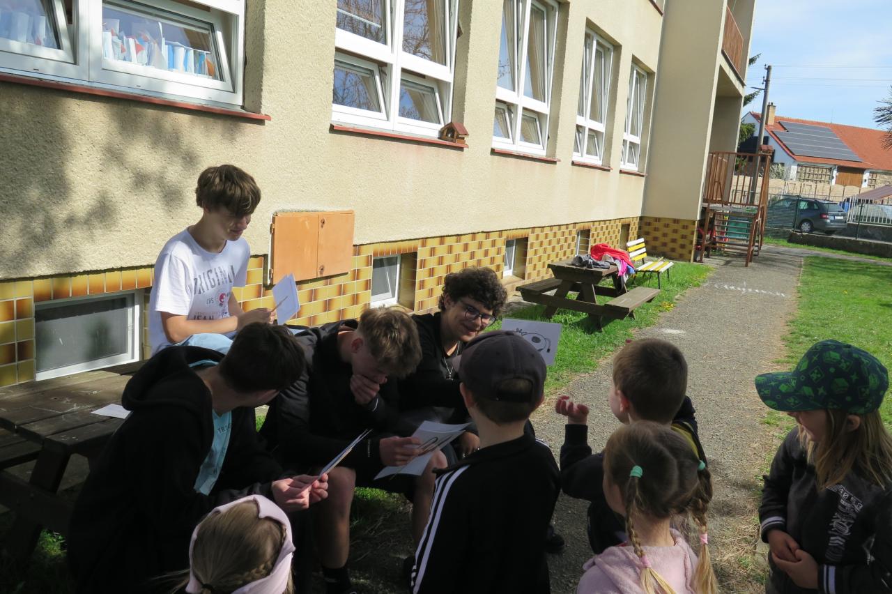 Úkol pro devítky zněl jasně, během dvou hodin připravit úkoly pro děti z mateřské školy a pomoci jim s jejich plněním na zahradě. Žáci nakreslili velikonočního zajíce, do kterého děti házely víčka. Žáci si připravili obrázkové povídání o kohoutovi a slepičce, rozstříhali kraslice na hledání dvojic a mnoho dalších úkolů. Zároveň po zahradě poschovávali pokreslené kamínky jako odměnu.