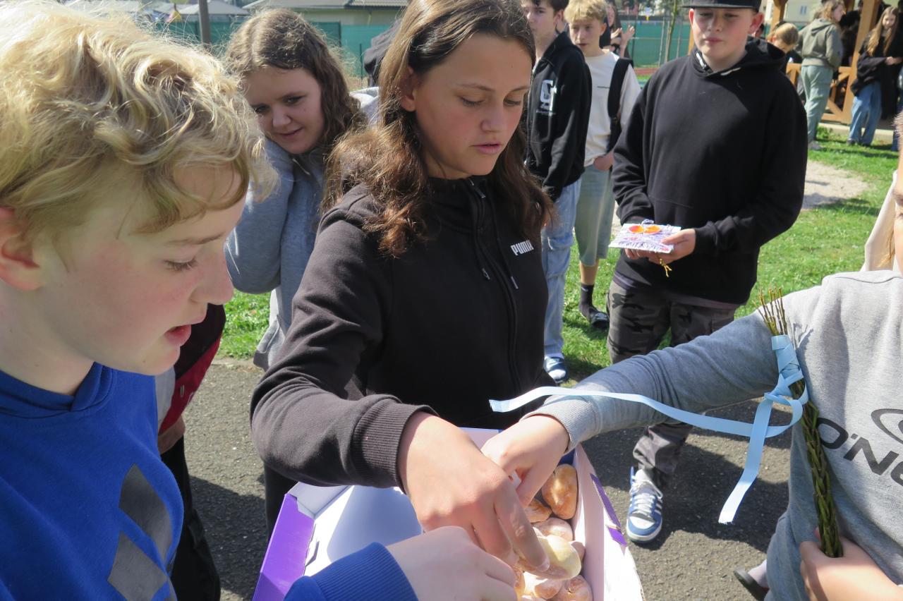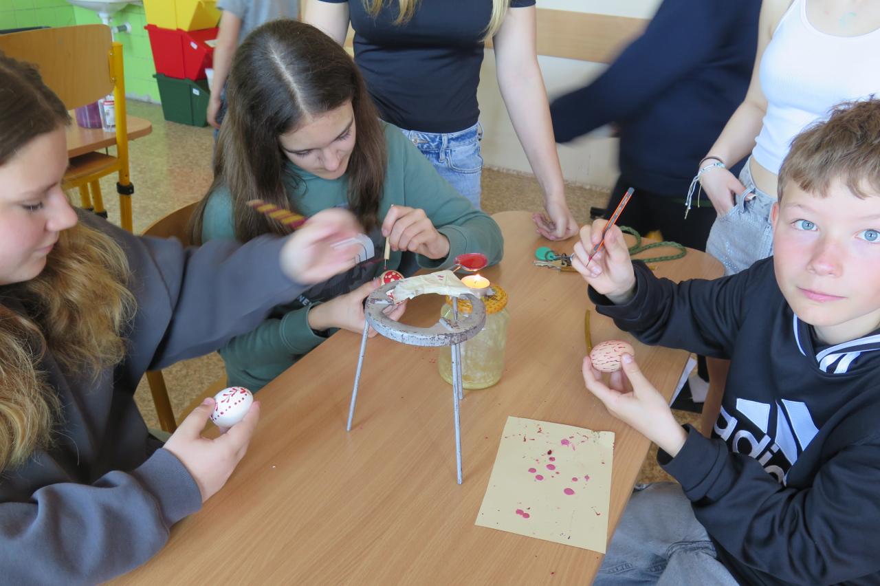 Ostatní žáci se během minulého týdne rozdělili do šesti stanovišť a měli možnost si během dopoledne vyzkoušet dvě z aktivit. Pletly se tradiční pomlázky, pekli jsme jidáše, sladké i slané keksy, zdobila se vajíčka buď tradičně voskem nebo i bavlnkami, dělali jsme velikonoční ozdoby a zápichy, vyráběla se skořápka z toaletního papíru a balonku a dekoroval se velikonoční rámeček. Doufáme, že se žáci zase přiučili něco nového jako v předvánočním Dni řemesel.
